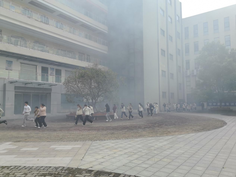 11点50分警报哨音响起,演练正式开始。参与师生在工作人员引导下,迅速低姿弯腰、捂住口鼻,沿预定路线快速、有序撤离至安全集结区。整个过程紧张而不慌乱,不到4分钟,约1500名师生全部安全疏散,有效检验了学校的应急响应机制。