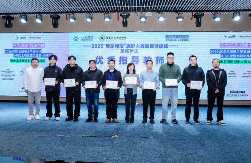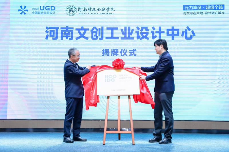 河南工业设计研究院副院长訾鹏和副校长孙文杰共同为“河南文创工业设计中心”揭牌,该中心于2024年9月被省工业和信息化厅认定为省级工业设计中心。中心将致力于推动本土文创设计与产业需求的深度融合,积极服务中原文化建设。活动现场还为往届联合毕业设计优秀指导教师及“老家河南”摄影大赛获奖者颁奖,并共同启动了2026UGD河南站活动与“老家河南”摄影作品展。