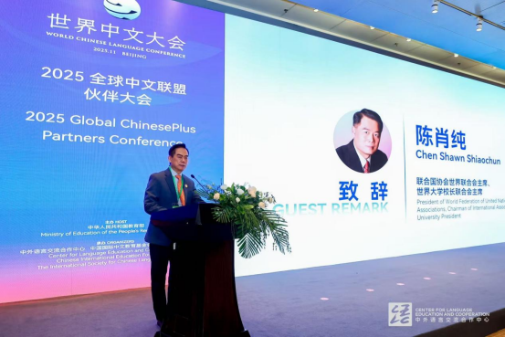 作为大会的重要组成部分,“2025全球中文联盟伙伴大会”于11月16日在北京国家会议中心举行。联合国协会世界联合会主席、世界大学校长联合会主席、郑州西亚斯学院创办人陈肖纯理事长应邀出席并致辞,与中外语言交流合作中心主任郁云峰、世界汉语教学学会会长钟英华等嘉宾共同探讨了中文国际传播的路径与广阔前景。