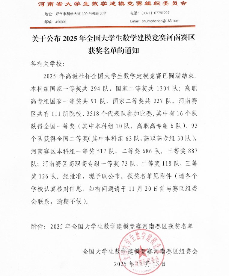 近日,2025年全国大学生数学建模竞赛落下帷幕。河南测绘职业学院参赛团队凭借扎实的专业基础、严谨的逻辑思维与出色的团队协作,在激烈竞争中脱颖而出,共获省级一等奖2项、二等奖2项、三等奖2项,充分展现了河南测绘职业学院在学科建设和创新人才培养方面的扎实成效。