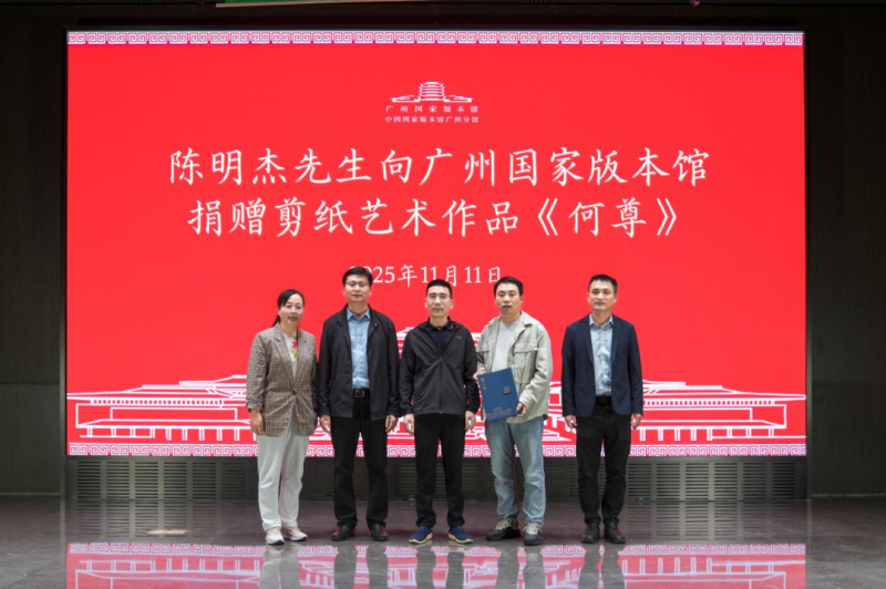 2025年11月11日,漯河职业技术学院省级技能大师工作室主持人陈明杰老师应邀赴广州国家版本馆,参加文化交流活动,并正式向该馆捐赠其精心创作的多层套色写实剪纸作品——《何尊》。广州国家版本馆馆长张伟涛、副馆长黄磊,漯河职业技术学院党委副书记周俊伟,校侨联秘书长胡安娜等共同出席捐赠仪式。