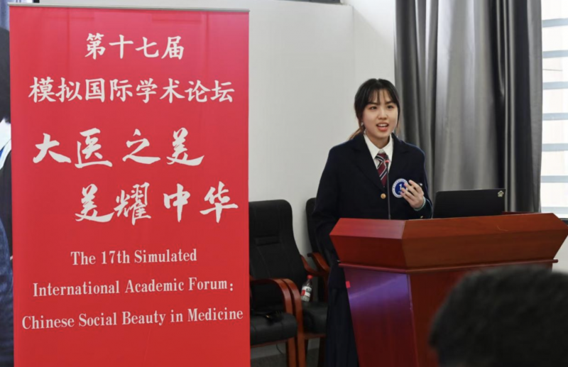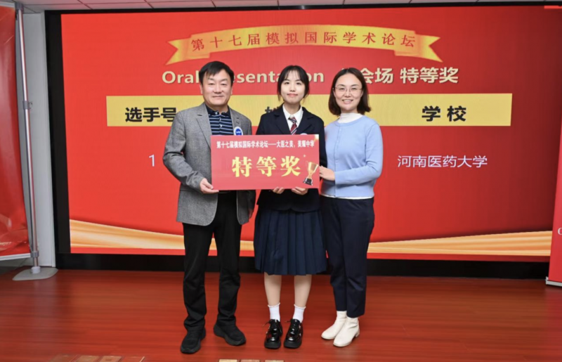 近日,在第十七届模拟国际学术论坛决赛上,河南医药大学峻极书院2023级菁英医师班学生杨怡涵,在外语学院教师雍文明、石帅的指导下,历经多轮选拔,凭借扎实的专业基础、严谨的学术思维与出色的英语表达能力,在竞争激烈的英语汇报大赛环节中脱颖而出,荣获最高奖项特等奖。