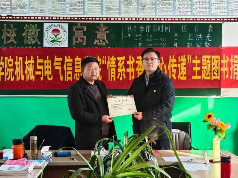 11月18日,商丘学院机械与电气信息学院团总支学生会在团总支副书记兼学生会执行主席郑力源的带领下,前往雪枫小学开展图书捐赠活动,为师生送去关怀与温暖,并带去学院党总支书记、院长蒋学华的亲切问候。