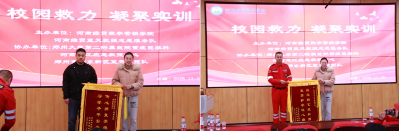 活动最后,数字营销学院向郑州大学第二附属医院重症医学科与河南龙江应急救援中心授予锦旗,感谢他们对校园急救教育的大力支持。