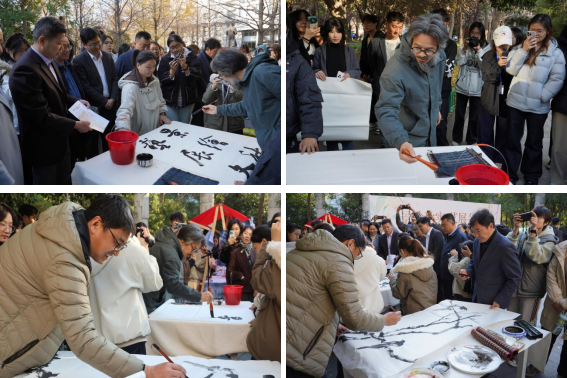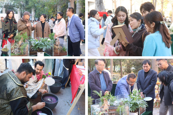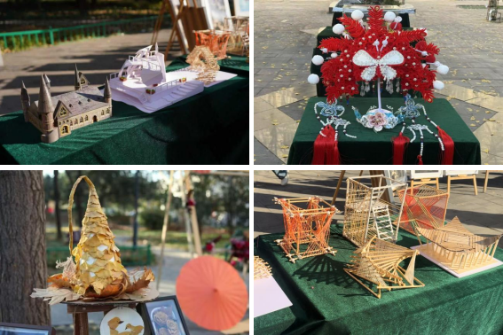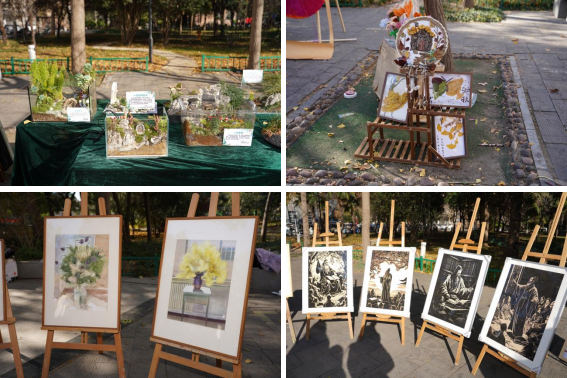 本次活动由艺术观赏区和互动体验区组成。在艺术观赏区,学院师生以银杏叶、果实等可持续材料为素材,制作了银杏帽、风铃、虎头等手工艺品和产品材料与工艺、植物景观等课程实践成果。学院教授、中国女画家协会会员、河南省美术家协会会员徐艳秋老师和学院副教授、河南美术家协会会员郭璐妍老师的《花卉静物》《布道者》《逝》《夏天的鱼》等获奖作品在学校活动中展示,受到了师生广泛关注和一致赞赏。艺术与设计学院副教授、中国书法家协会会员、河南省书法家协会教育委员会委员杜旭光老师和副教授、河南省美术家协会会员、河南省国画家协会会员宁传华老师更是现场用笔、墨、纸、砚书写、绘画出一幅幅意蕴悠长的红叶主题画卷,将本次活动推向高潮。悄然中,学生的手工作品《扇间秋韵》杏叶秋弦》《叶里的小世界》《写给秋天的一封信》等在金色秋风中绽放,点缀着枝头的秋光的明媚与创作的鲜活,把观众引入了轻盈又治愈的秋日梦境中。艺术与设计学院教授孟滨老师和副教授王娜老师分别为与会领导介绍了现场展示作品的内涵及制作工艺。一件件作品精巧细致、立意深远、意蕴悠长,充分展现了两院师生深厚的艺术素养、扎实的专业功底、灵巧的手工技艺、丰富的想象力和学校深耕课程育人的实践成效。在互动体验区,我们给参与师生准备了投壶、漆扇、滴胶、集叶等丰富多彩的非遗体验活动。