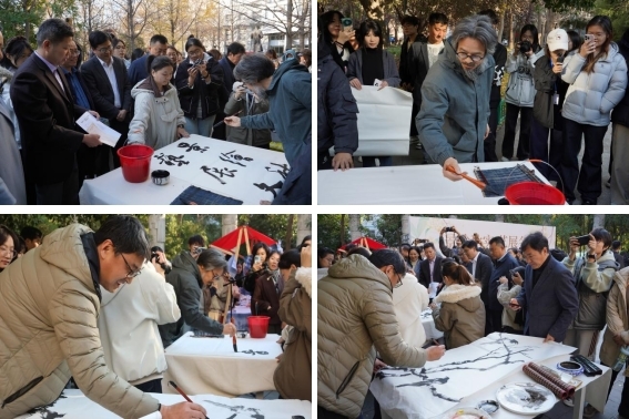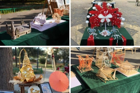 本次活动由艺术观赏区和互动体验区组成。在艺术观赏区,学院师生以银杏叶、果实等可持续材料为素材,制作了银杏帽、风铃、虎头等手工艺品和产品材料与工艺、植物景观等课程实践成果。学院教授、中国女画家协会会员、河南省美术家协会会员徐艳秋老师和学院副教授、河南美术家协会会员郭璐妍老师的《花卉静物》《布道者》《逝》《夏天的鱼》等获奖作品在学校活动中展示,受到了师生广泛关注和一致赞赏。学院副教授、中国书法家协会会员、河南省书法家协会教育委员会委员杜旭光老师和副教授、河南省美术家协会会员、河南省国画家协会会员宁传华老师更是现场用笔、墨、纸、砚书写、绘画出一幅幅意蕴悠长的红叶主题画卷,将本次活动推向高潮。悄然中,学生的手工作品《扇间秋韵》杏叶秋弦》《叶里的小世界》《写给秋天的一封信》等在金色秋风中绽放,点缀着枝头的秋光的明媚与创作的鲜活,把观众引入了轻盈又治愈的秋日梦境中。学院教授孟滨老师和副教授王娜老师分别为与会领导介绍了现场展示作品的内涵及制作工艺。一件件作品精巧细致、立意深远、意蕴悠长,充分展现了两院师生深厚的艺术素养、扎实的专业功底、灵巧的手工技艺、丰富的想象力和学校深耕课程育人的实践成效。在互动体验区,我们给参与师生准备了投壶、漆扇、滴胶、集叶等丰富多彩的非遗体验活动。