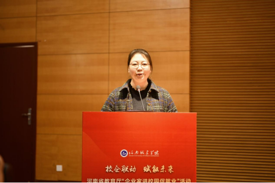 为深化校企合作、校地协同,搭建就业桥梁,助力高校学子精准对接市场需求,11月20日,由河南省教育厅主办,省大中专毕业生就业创业促进会和河南城建学院共同承办的河南省教育厅第二期“企业家进校园促就业”活动举行。河南省大中专毕业生就业创业促进会会长岳修峰、我校校长陈桂香、平顶山文化艺术职业学院副校长杨蓝生出席活动,活动邀请到了河南省测绘地理信息中心主任肖峰、平煤神马股份有限公司建工集团总经理刘升、平顶山高新技术开发区科技创新局局长杨宏、秉润集团联合创始人夏梦遵作主题报告,平顶山各兄弟高校领导、招生就业处相关负责人、就业指导教师、我校二级学院分管就业领导、校友企业代表、各高校大二大三学生代表参加活动,活动由我校副校长毛艳丽主持。