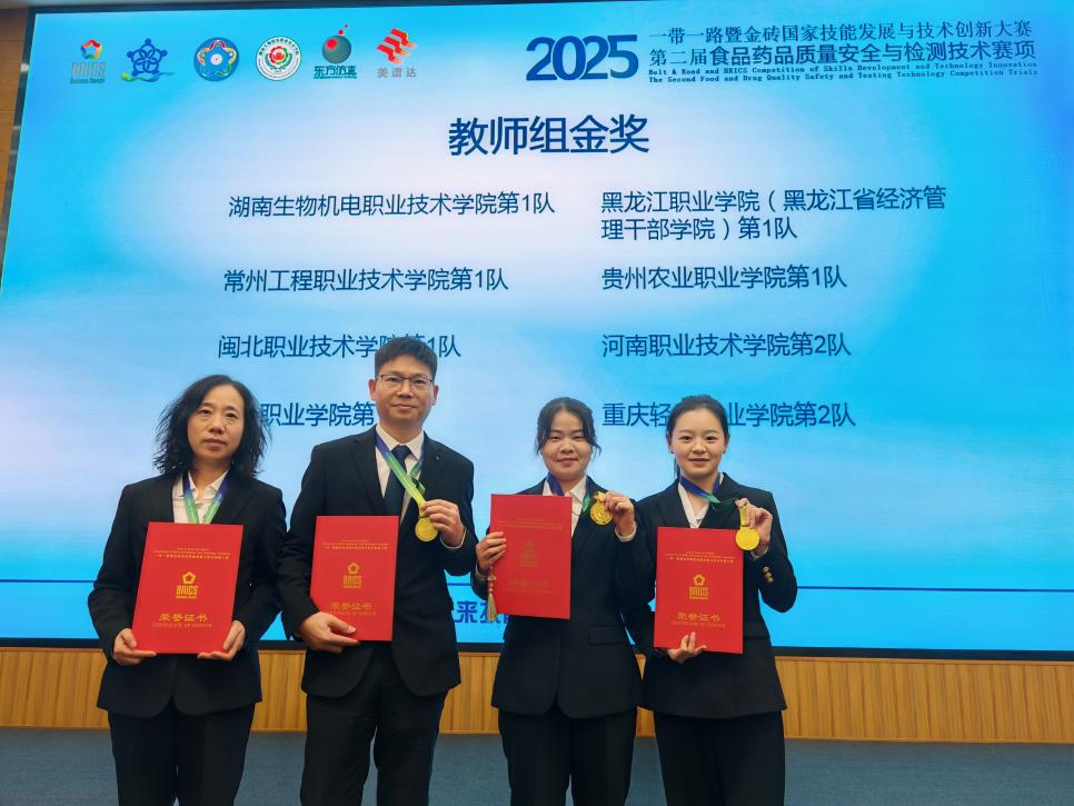 近日,2025“一带一路”暨金砖国家技能发展与技术创新大赛——第二届食品药品质量安全与检测技术赛项在湖南长沙举行。河南职业技术学院食品工程学院教师侯丽芬、崔萌甜、宁梦鸽、满勇组队参赛,凭借扎实的专业功底、精湛的操作技能与出色的团队协作,在全国76支教师参赛队伍中脱颖而出,荣获一等奖,展现了学校教师的卓越风采。
