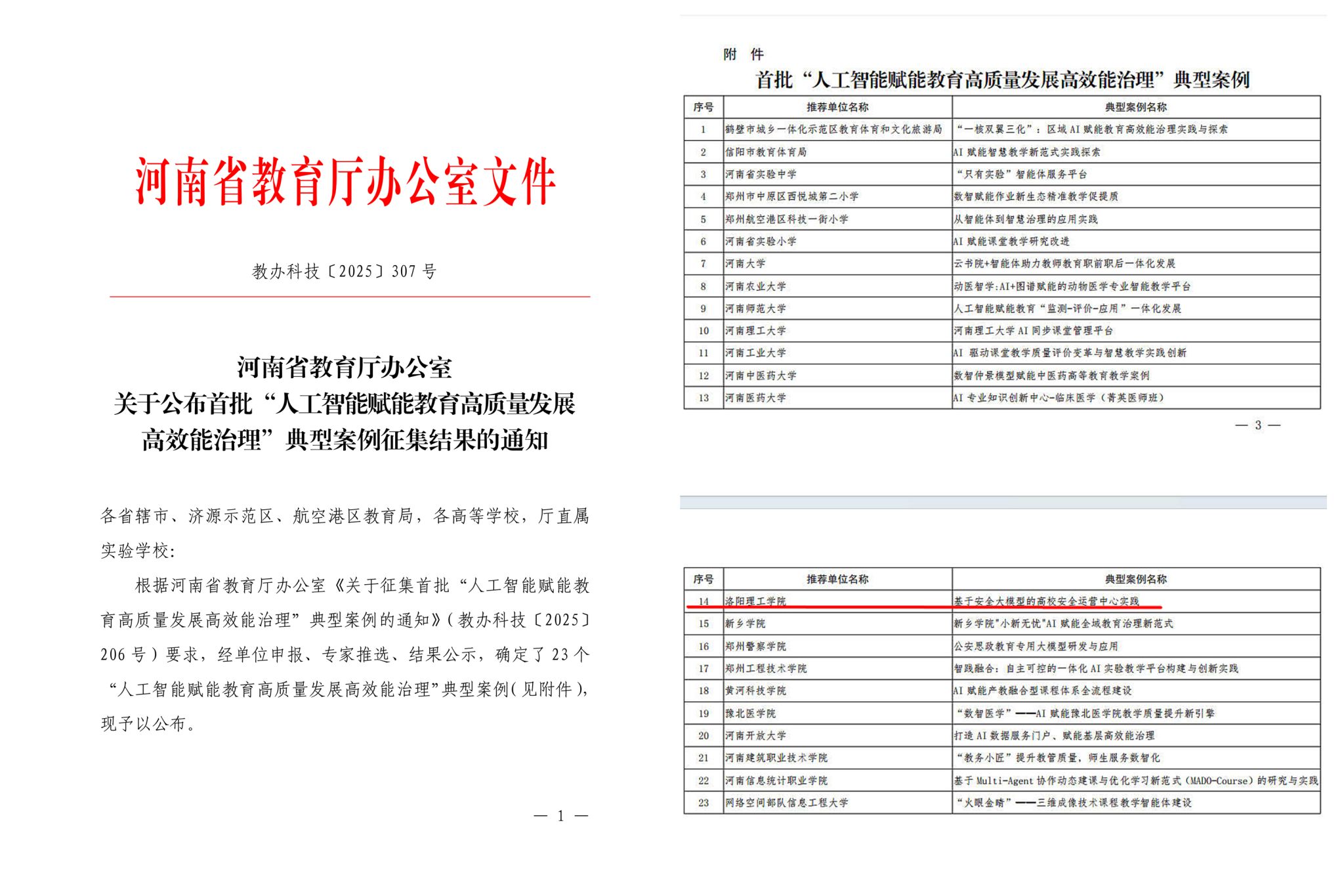 近日,河南省教育厅办公室印发教办科技〔2025〕307号文件,公布首批“人工智能赋能教育高质量发展高效能治理”典型案例征集结果。洛阳理工学院申报的《基于安全大模型的高校安全运营中心实践》入选全省23个典型案例名单。