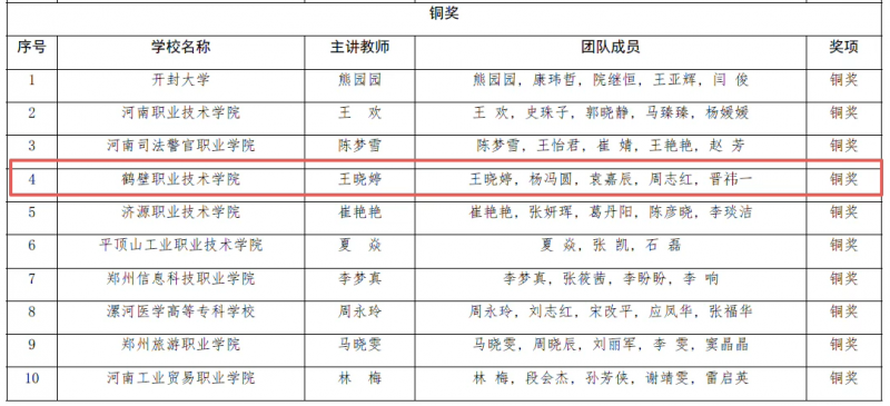 11月25日,河南省教育厅公布第三届全国大学生职业规划大赛河南省赛课程教学赛道结果,鹤壁职业技术学院王晓婷团队斩获铜奖,实现学校在此赛项、赛道上零的突破。
