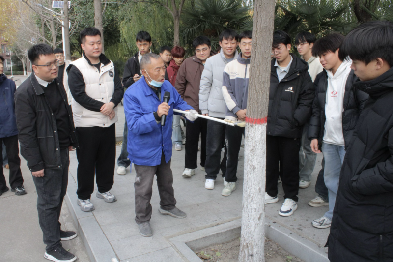 此次实践课突破传统课堂局限,将教学现场延伸至校园实景。活动伊始,后勤处专业人员为学生系统讲解树木冬季涂白的生态意义与操作规范。技术人员指出,涂白不仅能反射阳光、调节树干温差,防止冻裂,其配方中的生石灰与硫磺更能有效杀菌防虫,阻断害虫越冬途径。