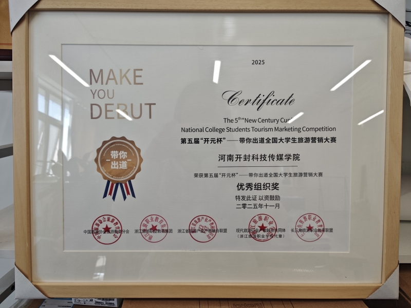 近日,第五届“开元杯”——带你出道全国大学生旅游营销大赛决赛在浙江省湖州市德清县莫干山开元森泊度假乐园圆满落幕。经过激烈角逐,河南开封科技传媒学院(以下简称“科传学院”)旅游管理专业2022级学生高娇艳在本次大赛中表现优异,与兄弟院校组成的联合团队勇夺全国二等奖。同时,科传学院商学院荣获大赛“优秀组织奖”,双喜临门,成绩斐然。