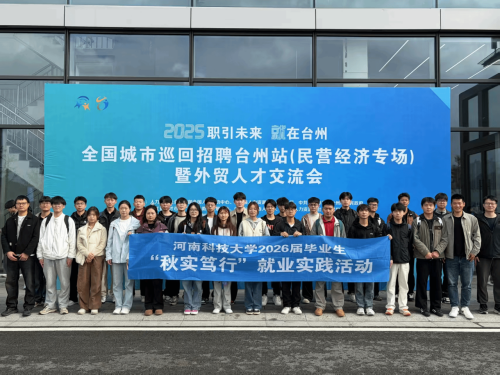 为拓宽毕业生就业渠道,深化校地人才合作,近日,应浙江天台县人才交流中心邀请,河南科技大学组织30名2026届毕业生代表赴浙江台州开展“秋实笃行”就业实践活动。本次活动以“职引未来,就在台州”为主题,由台州市人力资源和社会保障局主办。机电工程学院本科生工作办公室主任徐波波、车辆与交通工程学院本科生工作办公室副主任张亮亮作为带队教师参加。