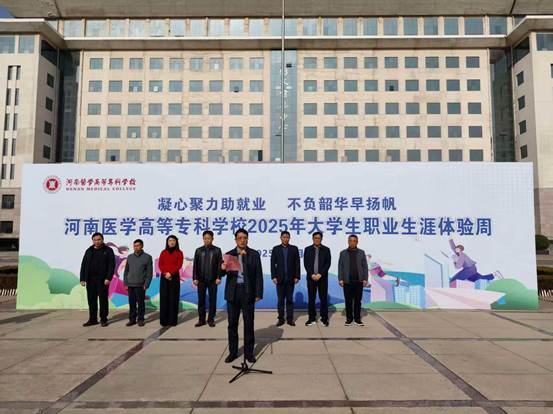 11月11日至13日,河南医学高等专科学校在图文信息中心前广场举办2025年大学生职业生涯体验周活动。校党委副书记李鹏涛出席活动并致辞,各学院负责同志、2025级新生辅导员和大学生就业创业指导中心、公共基础部就业指导教研室工作人员以及学生代表参加活动。