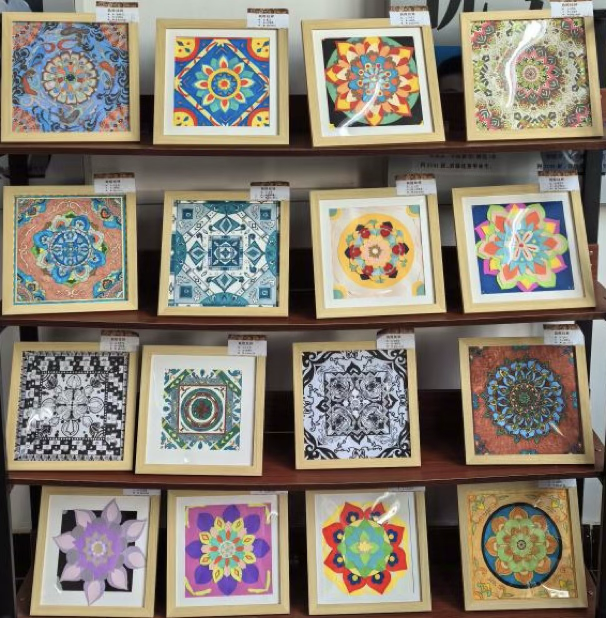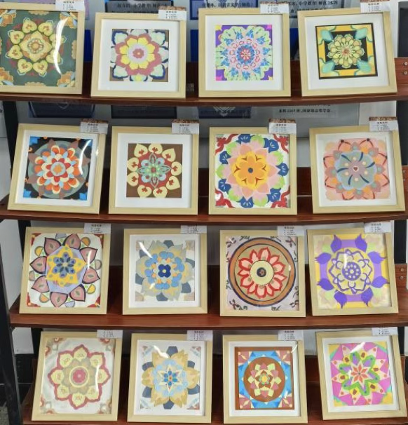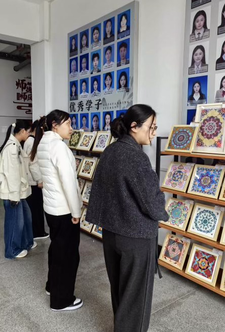 一幅幅精心装裱的作品整齐陈列,色彩明快、风格各异的纹样相互交织,营造出浓厚的艺术氛围。观展师生不时驻足,或细细品味纹样中蕴含的文化细节,或轻声交流对作品的理解与感受。同学们纷纷表示,通过观赏这些作品,不仅感受到了敦煌纹样的艺术魅力,更对中华优秀传统文化产生了浓厚的兴趣。而亲身参与创作的学生则表示,此次创作经历让自己深入触摸到了传统艺术的精髓,既提升了自身的艺术设计能力,也增强了文化自信与传承意识。