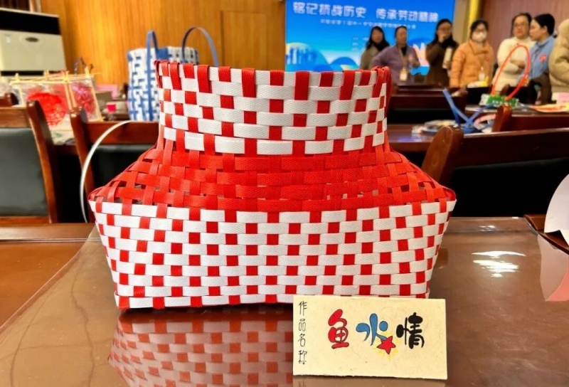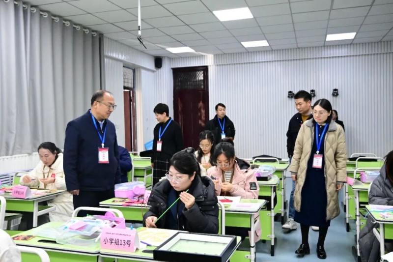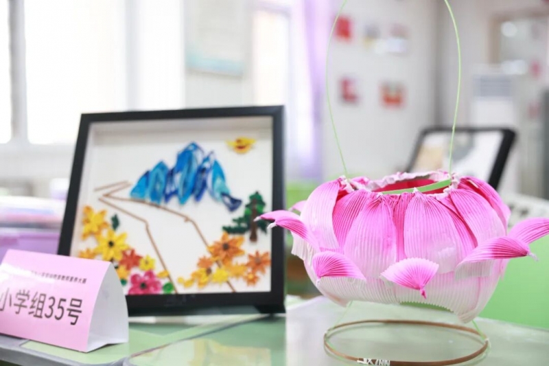 比赛现场,教师全神贯注、巧手制作,展现出扎实的劳动技能与教学素养。在必选项目纪念中国人民抗日战争胜利80周年主题创作中,小学组选手衍纸作品构思新颖、主题鲜明,表达有创意,艺术手法运用得当,色彩协调、自然雅观;中学组选手利用彩色打包带编制一件抗战时群众常用器物,造型规整、技法娴熟,突出了实用性。在自选项目展示中,选手们结合地域特色及自身特长,制作了手工灯笼、布艺编制、布贴画、麦草画、虎头帽、手工布鞋等具有代表性的作品。