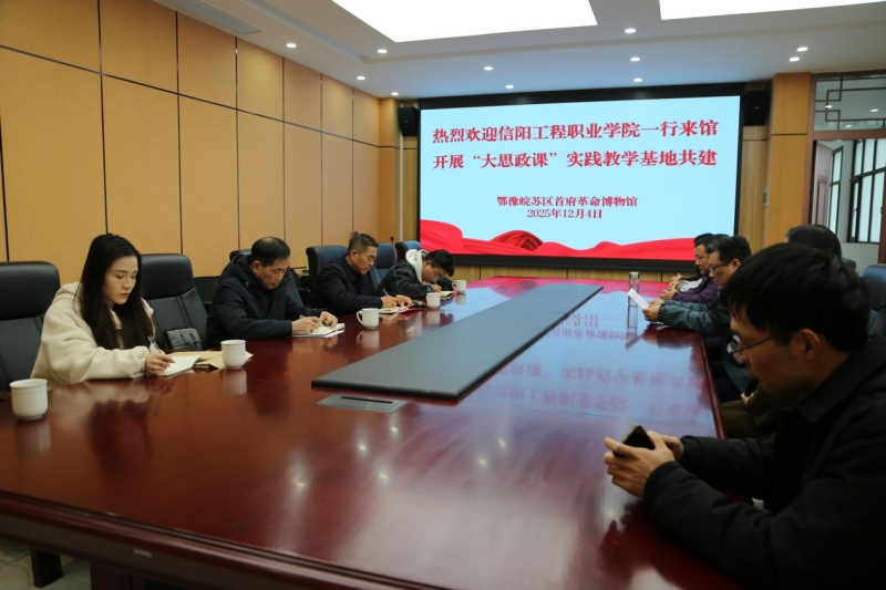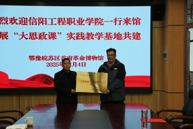 12月4日,信阳工程职业学院“大思政课”实践教学基地签约揭牌仪式在鄂豫皖苏区首府革命博物馆举行。此次校馆携手,旨在深度挖掘红色资源育人价值,推动思政小课堂与社会大课堂有机融合,为落实立德树人根本任务搭建重要平台。鄂豫皖苏区首府革命博物馆副馆长李森,信阳工程职业学院常务副校长杨金国等双方工作人员、教师代表共同出席仪式。