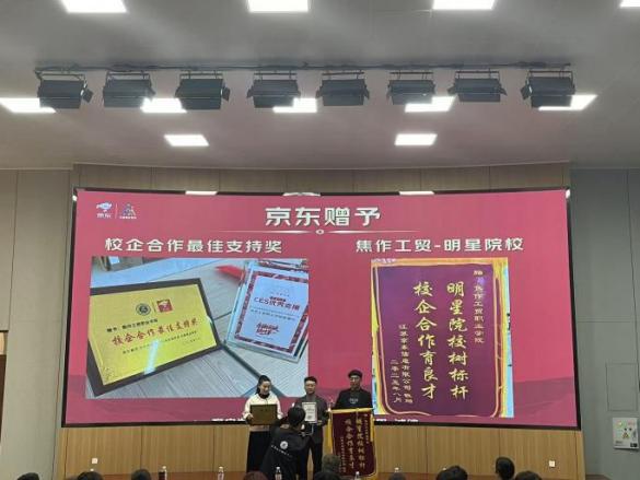 大会上,京东向学院授予了“校企合作最佳支持奖”“明星院校”等锦旗及奖牌,现场掌声雷动,将大会气氛推向高潮。这一荣誉的授予充分体现了双方合作的深度与成果。京东校内项目主管杜宇凡在致辞时,对学院的人才培养质量给予高度认可。他提到,焦作工贸学子的专业素养和敬业精神令人印象深刻,不少毕业生凭借出色的能力已成为团队核心力量,这正是授予学院两项荣誉的根本原因。