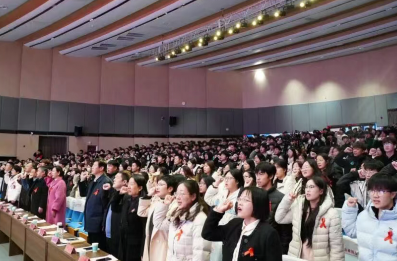 活动中穿插了有奖问答环节,同学们踊跃参与,现场气氛十分热烈。临近尾声时,校团委书记带领全体师生起立宣誓,承诺将积极向社会大众传递防艾知识,切实履行“关爱生命、消除歧视、科学防艾”的责任。