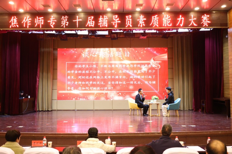 12月8日下午,焦作师范高等专科学校第十届辅导员素质能力大赛决赛在学术报告厅举行。校党委书记张现俭、校长相天东、党委副书记李秋生出席活动并为选手颁奖。组织部部长岳彤、马克思主义学院院长李彩红、宣传统战部部长宋喜龙、校团委书记李伟、心理健康教育与咨询中心副主任李军霞担任评委。各学院党总支书记、副书记、学工办主任、辅导员及部分学生代表观看了比赛。