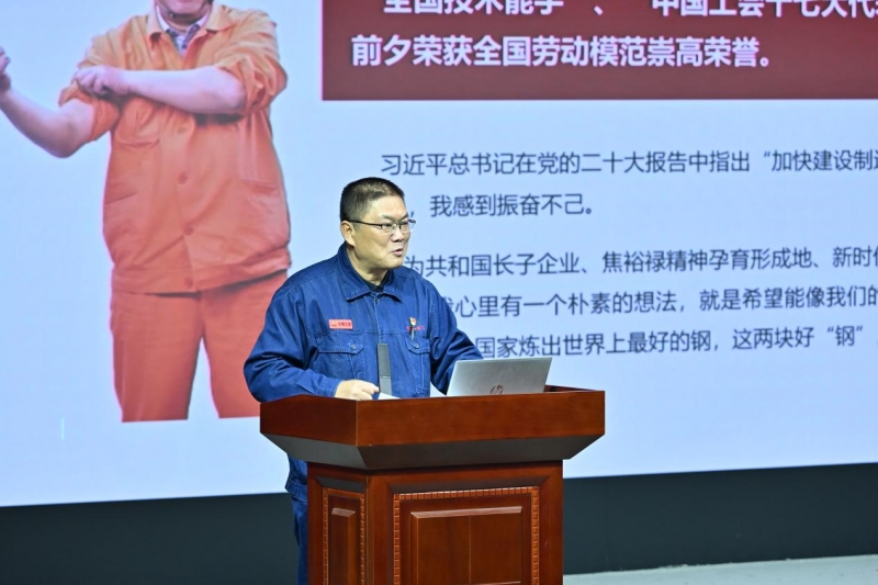 杨金安以《以党的二十大精神为指引,争当大国工匠,建功制造强国》为主题作宣讲。他用朴实的语言,深情回顾了自己41年如一日坚守炼钢一线、从普通工人成长为大国工匠的奋斗历程,特别提到了焦裕禄精神对自己的深刻影响,正是这种精神激励他不断钻研、精益求精。杨金安还介绍了大工匠工作室在技术创新、攻克生产难题及高技能人才培养方面所取得的丰硕成果,并坚定表示将充分发挥示范作用,带领团队奋力突破金属材料“卡脖子”技术,为中国制造自主创新贡献力量。