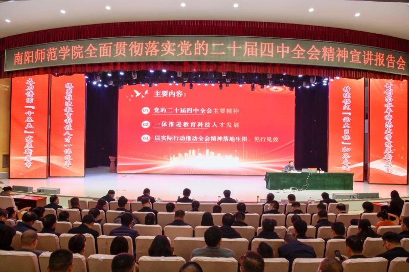 12月9日上午,南阳师范学院党委书记张宝锋在校音乐厅作学习贯彻党的二十届四中全会精神集中学习宣讲。全体校领导、全体处级干部、全体学工队伍、思政课教师参加。报告会由校党委副书记刘红林主持。