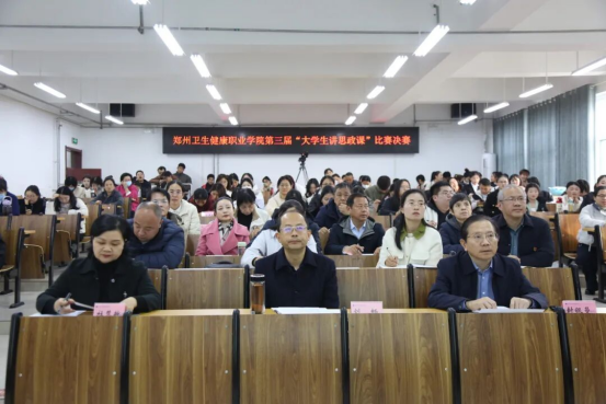 本次比赛由郑州卫生健康职业学院马克思主义学院联合团委、教务处、党委宣传部共同主办。校党委书记刘畅、校长封银曼、副校长杜慧敏出席活动。党委学工部部长常利普、人事处处长梁景芝、教务处副处长贾欣,护理学院党总支副书记王济发、办公室主任高慧,康复医学院办公室主任王玉华、学工办主任崔宇炜,药学院副院长张晓红、党总支副书记赵建伟,运动健康学院院长葛志勇、党总支副书记芮广杰,马克思主义学院教师李云芝担任专家评委。28名在初赛中荣获二等奖、优秀奖的选手担任大众评委。全体副科级以上干部、马克思主义学院专兼职教师及学生代表到场观摩。