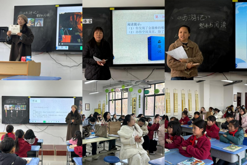 各班级围绕不同主题展开深度研修。其中,一班在指导团队的带领下,6位教师围绕《西游记》进行“整本书阅读教学”课例展示,通过人物解读、方法指导、情节梳理与主题升华等方面的细致演绎,系统呈现“整本书阅读教学”的多元实施路径。