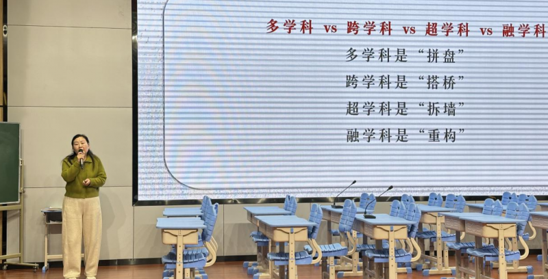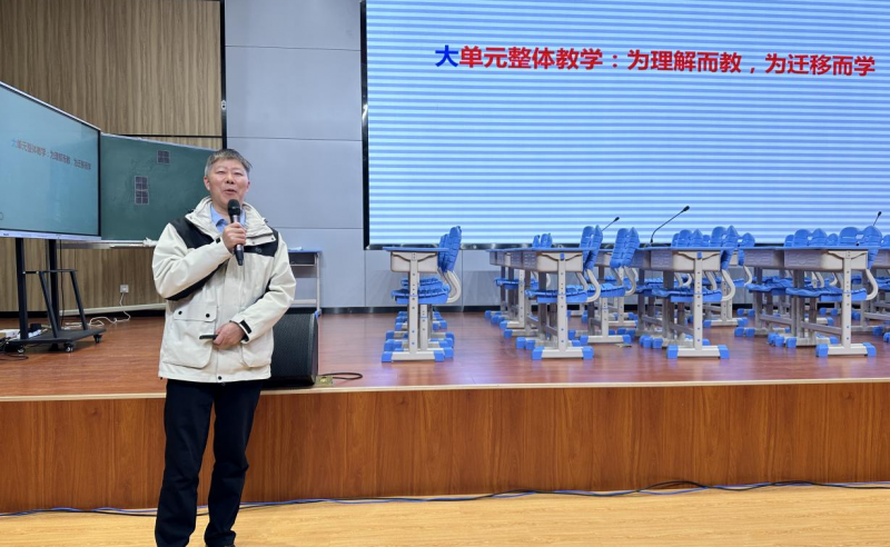 活动以“单元整体教学”为核心主题拉开序幕。六班指导团队的袁晓亚老师带来题为《核心素养下单元整体教学设计策略与实施》的报告,紧扣育人目标,指出单元整体教学是破解碎片化教学、实现学科育人的重要抓手,并从学习情境创设、任务设计等五个维度提供了可操作的实践框架。