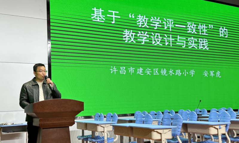 “‘教—学—评’一致性”主题分享与展示压轴登场。七班指导团队的安军虎老师以《基于教学评一致性的教学设计与实施》为题,围绕“研读课标—解读教材—了解学情—制定目标”四步路径,结合典型课例剖析教学目标制定中的常见问题,提出规范叙写教学目标的“四要素”(行为主体、行为动词、行为条件、表现程度),确保教学目标可教、可学、可评。