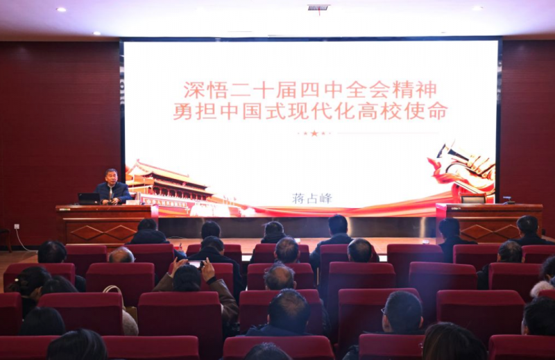 蒋占峰以“深悟党的二十届四中全会精神 勇担中国式现代化高校使命”为题,从“党的二十届四中全会召开的重大意义”“准确把握‘十五五’时期在基本实现社会主义现代化进程中的重要地位”“深刻领会‘十五五’时期经济社会发展的指导方针和主要目标”“全面理解‘十五五’时期经济社会发展的战略任务和重大举措”“坚持和加强党的全面领导 凝聚起推进中国式现代化的磅礴力量”“学思践悟凝共识 新工开启新征程”六个方面,结合翔实数据与生动案例,对全会精神作了深刻阐释和解读。