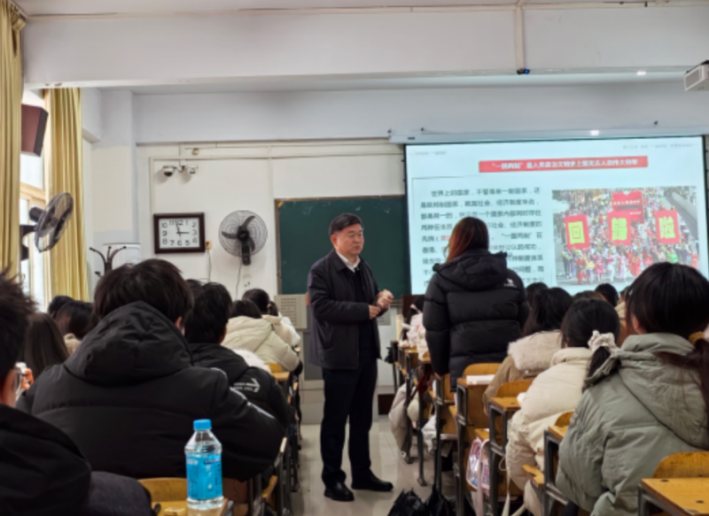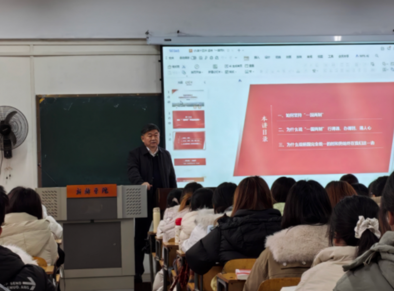 近日,新乡学院党委书记王孝俊走进教室,为2024级英语本科1班、汉语言文学本科1班的同学讲授思政课。授课内容为《习近平新时代中国特色社会主义思想概论》课程第十五章《坚持“一国两制”和推进祖国统一》,围绕“如何全面准确理解和贯彻‘一国两制’方针”“为什么说‘一国两制’是保持港澳长期繁荣稳定的最佳制度”“为什么说祖国完全统一的时和势始终在我们这一边”三个核心问题展开教学。