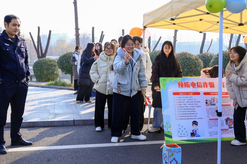 八大主题摊位各具特色,趣味与实用兼备,让安全教育入脑入心。在消防安全区,平原示范区消防大队的李青等教官现场指导,学生们亲手穿戴消防服、防毒面具,沉浸式感受消防员的日常工作;交通安全区别出心裁设置呼气式酒精测试实验,直观展现食品对酒精检测结果的影响,搭配“交通飞行棋”游戏,让交通规则在趣味互动中深入人心;网络安全区将传统投壶游戏与防诈骗问答相结合,学生们在投壶竞技的同时,轻松掌握识别“刷单返利”“冒充客服”等骗局的技巧;防暴恐安全区里,警务教官现场演示防护器械使用方法,手把手教学提升学生应急自卫能力。