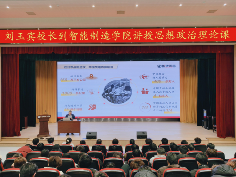 12月17日,河南地矿职业学院党委副书记、校长刘玉宾走进勤奋楼第二学术报告厅,以“纪念抗战胜利,坚定民族信念”为题,为智能制造学院师生讲授了一堂深刻而精彩的思政课,引导师生铭记历史、勇担使命。本次授课由智能制造学院党总支书记马瑾瑞主持,200余名师生到场聆听学习。