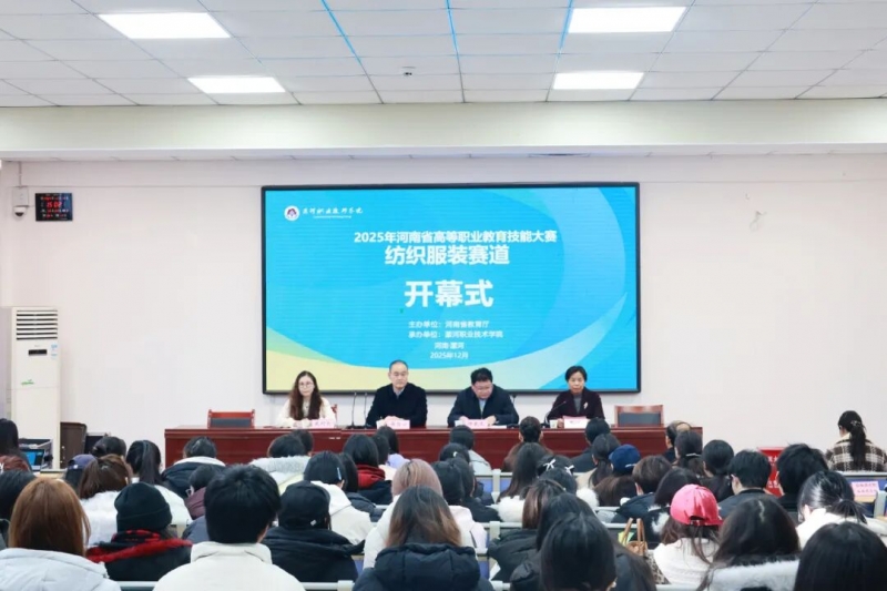 12月17日,由河南省教育厅主办的2025年河南省高等职业教育技能大赛纺织服装赛道在漯河职业技术学院举行。校长薛存心、裁判长河北科技大学纺织服装学院侯东昱教授、仲裁长河南地矿职业学院杨健出席开幕式。来自全省9所高职院校的20支参赛队院校的领队教师、指导教师与参赛选手参加。开幕式由副校长石晓主持。
