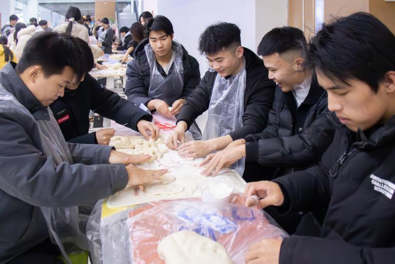 包饺子体验环节暖意融融,师生组队、分工协作,揉面、包馅、捏形,相互交流技巧,分享节日喜悦。现场弥漫着面粉清香,伴随着欢快音乐,同学们因协作变得更加熟络,师生间的距离也在互动中悄然拉近。志愿者们穿梭其间,有序开展食材分发、现场引导等服务,保障活动顺畅进行。