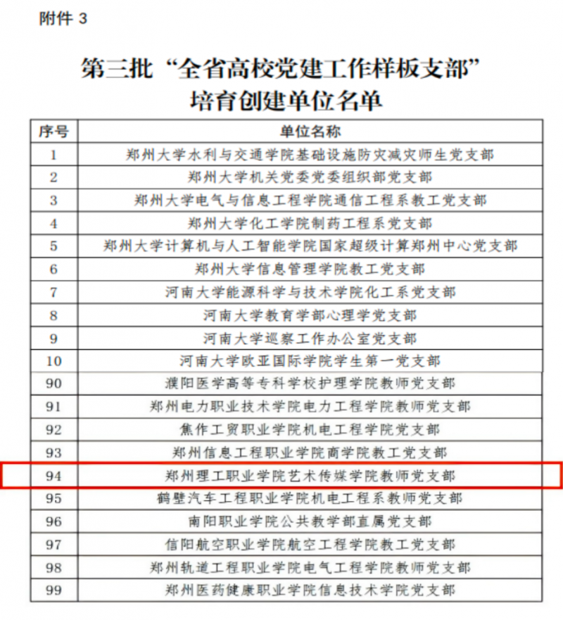 近日,河南省教育厅发布关于全省教育系统党建强基引领“三级联创”及第三批全省高校“双带头人”教师党支部书记工作室评选结果的通知,郑州理工职业学院艺术传媒学院教师党支部凭借扎实的党建工作基础、突出的育人成效及鲜明的特色优势,获评“全省高校党建工作样板支部”培育创建单位称号,这是该校党建工作取得的又一重大标志性成果。