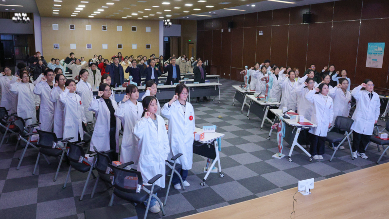 活动接近尾声,杨国平带领全体师生重温医学生誓言。肃穆的氛围中,师生们肃立齐声朗诵,铿锵誓言不仅重申了医学事业“敬佑生命、救死扶伤”的崇高使命,更强化了医学生“无私奉献、恪守医德”的职业信念,为整场活动画上圆满句点,也为学子们的医学之路注入精神力量。