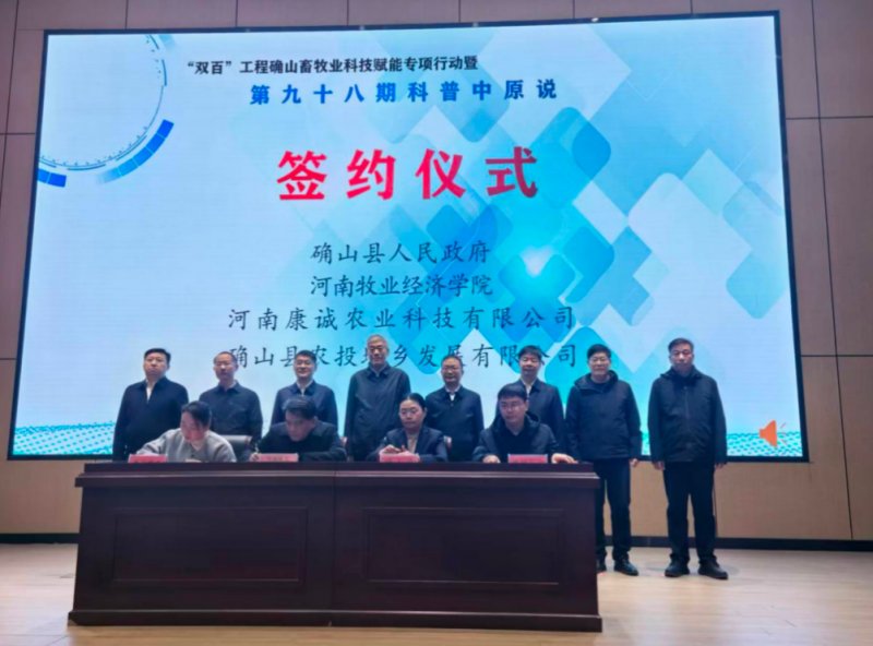 期间,河南牧业经济学院与确山县政府、河南康诚农业科技有限公司、确山县农投城乡发展有限公司现场签订合作协议;驻马店市人力资源和社会保障局向“双百”工程河南省服务基层专家团团长、河南牧业经济学院社会服务办公室主任胡华锋授旗;确山县政府向专家团11名成员颁发聘书。