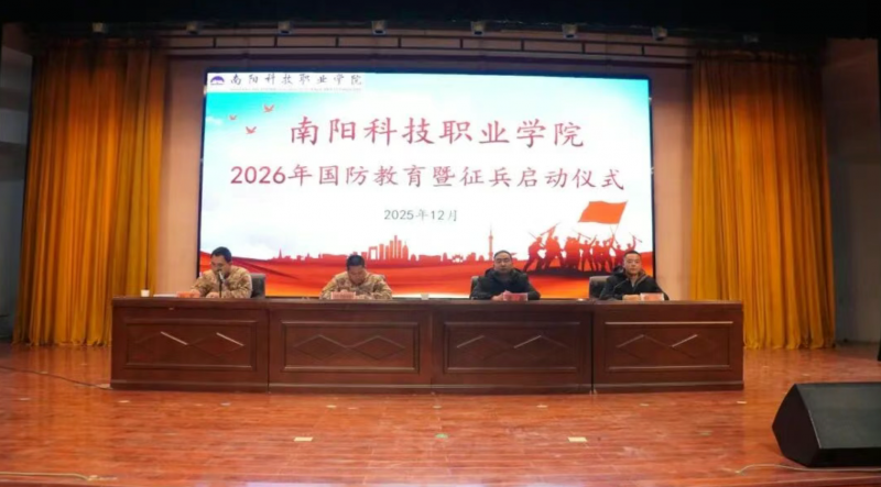 12月17日下午16:10,南阳科技职业学院2026年国防教育暨征兵启动仪式在学术报告厅盛大举行。市征兵办副主任、市人武部中校副部长焦俊卿,市人武部孙毅助理,学校学生处副处长辛鑫及各学院征兵工作负责人、师生代表共计840人齐聚一堂,共赴青春与国防的庄严之约。
