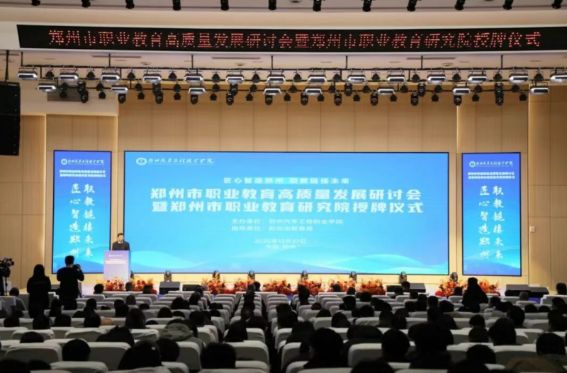 12月27日,郑州市职业教育高质量发展研讨会暨郑州市职业教育研究院授牌仪式在郑州汽车工程职业学院举行。河南省教育发展战略学会会长、河南省教育厅原副厅长陈垠亭,北京师范大学国家职业教育研究院院长、职业与成人教育研究所所长和震教授,郑州市政府、郑州市教育局等领导,河南天马集团董事长、学校创始人马锡林,理事长马嘉璐,党委书记张瑞春,党委副书记、校长薛培军等校领导班子成员,以及来自市域内职业院校、科研机构和相关企业的领导和代表们共同出席本次活动。学校600余名师生代表参加大会。