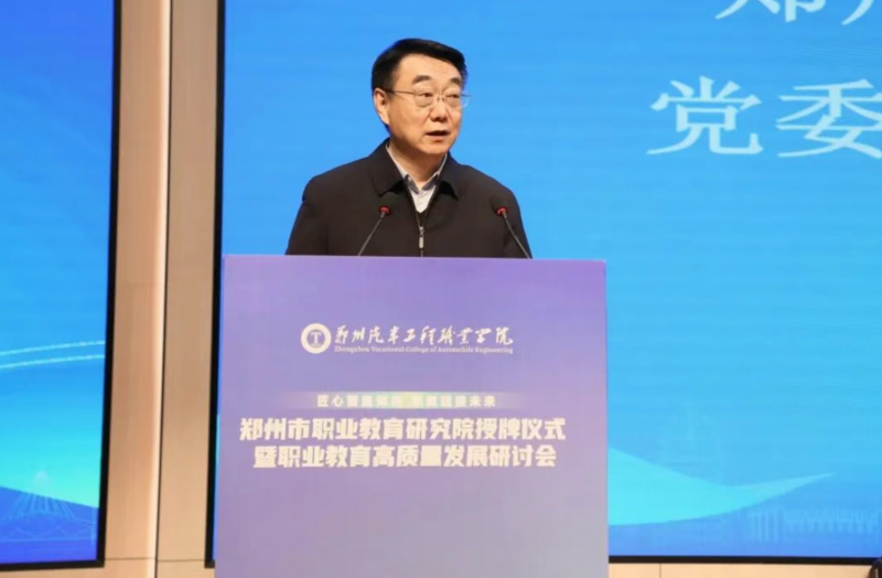 河南省教育发展战略学会会长、教育厅原副厅长陈垠亭在致辞中表示,河南作为全国首批职业教育创新发展高地,历来将职业教育摆在突出位置。他指出,当前正值新科技革命与产业变革的关键期,我省近期印发的《教育强省建设规划纲要》及配套行动计划为职业教育改革发展明确了方向、提出了更高要求。他强调,郑州作为国家产教融合试点城市,职业教育资源丰富、基础扎实,郑州汽车工程职业学院依托汽车产业园区办学,院企合作紧密,产教融合深入,具有很好的示范性,将研究院设在郑州汽车工程职业学院,具有独特的优势。他殷切期盼,在职业教育教学改革与人才培养创新的浪潮中,在教育强省、强市建设加速推进的进程中,在服务郑州国家中心城市建设和现代化产业体系发展的生动实践中,研究院能够蓬勃发展、不断壮大。省教育厅教育强省研究院和省教育发展战略学会愿与郑州市职业教育研究院以及各位专家一道,瞄准教育强省建设的战略目标,紧扣职业教育改革发展的部署,强化协同创新,全力打造高水平研究成果,为教育强省建设贡献智库力量。