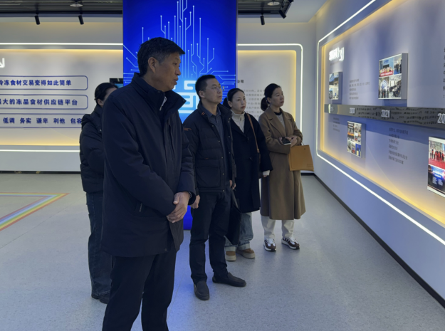 陈丙义一行首先参观了华鼎冷链科技展厅,通过企业宣传片、智能仓储系统演示及冷链技术实物展示,全面了解了华鼎冷链在智慧物流、仓配一体化、供应链管理等领域的创新成果。