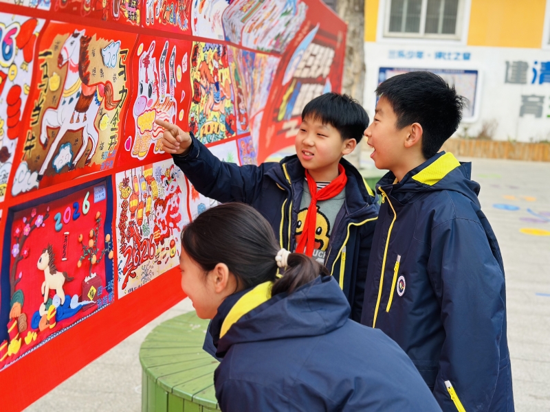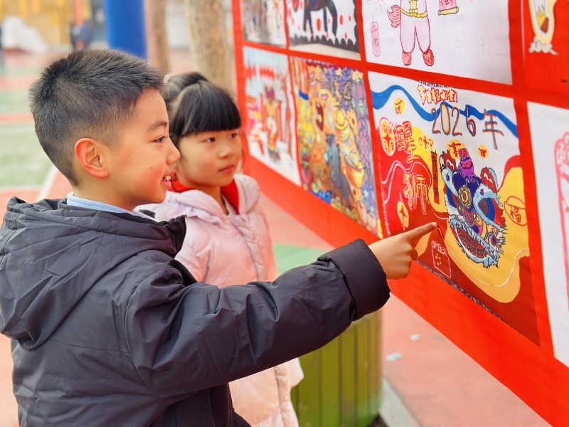 自12月22日起,校园化身为充满童趣与创意的艺术展场。各年级学生围绕新年主题,以绘画、手工、剪纸、书法等多种形式创作出一批富有传统文化韵味和时代气息的作品。一幅幅色彩斑斓的绘画、一张张精巧别致的剪纸、一件件造型独特的手工,不仅装点了教室,更在校园中以彩色条幅的形式集中展示,形成一道绚丽的校园风景线。同学们在课余时间驻足观赏、交流学习,在美的氛围中互学互鉴。