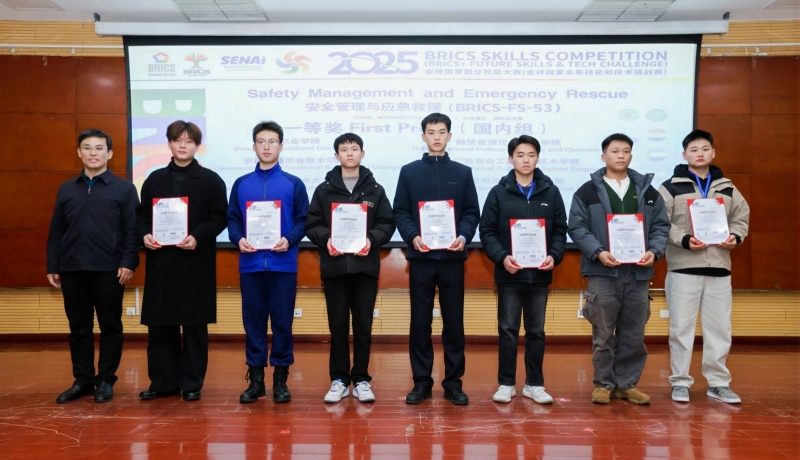 近日,2025年金砖国家职业技能大赛“安全管理与应急救援”赛项国际总决赛圆满结束。来自金砖国家及“金砖+”国家的78支参赛队伍同台竞技,经过激烈角逐,鹤壁能源化工职业学院应急管理系学生崔振亮、冯启航、赵康瑶、许浩凭借扎实的专业功底、默契的团队协作和出色的临场应变能力,斩获该项目国赛一等奖、国际银奖的亮眼成绩,同时范玉军等2名指导老师获得优秀指导专家奖。
