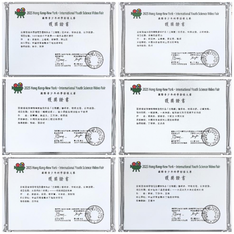 2025年5月,在河南省科学技术协会主办的“河南省青少年科技创新大赛”中,管理学院选送的作品一举拿下5个一等奖,并荣获团体三等奖,指导老师韦菲、陈芳获优秀指导教师奖。2025年10月,管理学院6支参赛队在香港——纽约国际青少年科学影像大赛中再创佳绩,分别获得专项奖1项、二等奖1项、三等奖5项。2025年12月,管理学院作品《1600度的千年浪漫——探究非遗打铁花》在北京2025视听作品展映中荣获“最佳文化传统传承奖”,实现了从科学到人文的跨界突破。“通过亲手操作实验,我们窥见了打铁花非遗背后的科学密码。高温下金属熔融飞溅、剧烈氧化的瞬间,正是“火树银花”的本源。我们不仅惊叹于古人凭经验掌握自然规律的智慧,也更懂得非遗是匠心与科学的结晶,值得我们以现代视角传承发扬。”管理学院学生刘江凯感叹道。