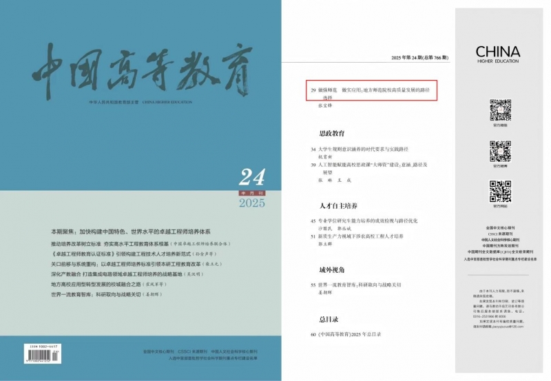 近日,中华人民共和国教育部主管、中国高等教育学会主办的权威学术期刊《中国高等教育》2025年第24期,刊发了南阳师范学院党委书记张宝锋教授署名文章《做强师范 做实应用:地方师范院校高质量发展的路径选择》。文章系统阐释了新时代地方师范院校改革发展面临的形势任务与机遇挑战,提出地方师范院校要坚持做强师范、做实应用,把握好师范办学与应用发展的权重均衡和互促关系,才能建成师范根基深厚、应用特色鲜明的高水平师范大学,更好助力经济社会高质量发展。