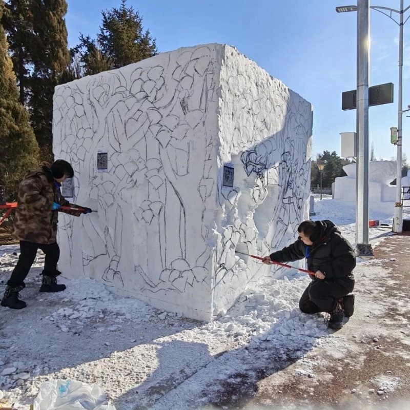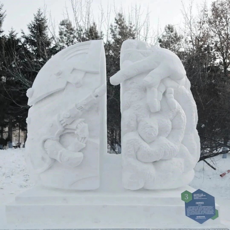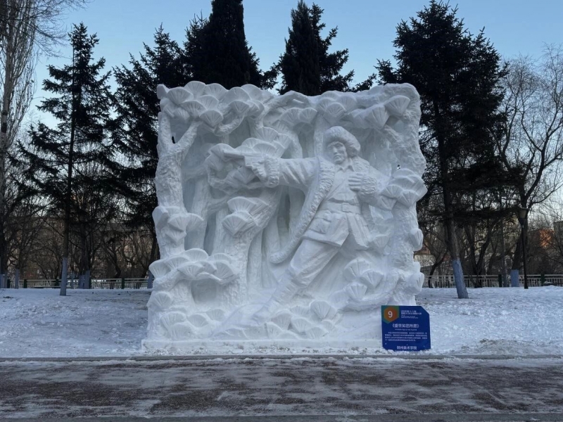 本次大赛要求参赛团队在4天时间内,于3米见方的雪块上完成全手工创作,既要抵御严寒挑战,更需实现创意与技艺的高度融合。学校作品《盛世如您所愿》紧扣时代脉搏,突出纪念中国人民抗日战争暨世界反法西斯战争胜利80周年主题,以杨靖宇将军驱寇御侮、舍生取义的英雄事迹为精神内核,通过高浮雕、浅浮雕与透雕相结合的综合技法,镌刻出先烈宁死不屈的铮铮风骨,辅以苍松密林的意象,隐喻中华儿女在民族复兴道路上赓续血脉、砥砺前行的精神传承,实现了从历史叙事到精神象征的艺术升华。