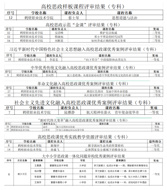 近日,中共河南省委教育工委办公室、河南省教育厅办公室公布了《关于2025年度优秀思政课程资源评审结果的公示》,鹤壁职业技术学院15位教师在多个评审类别中表现突出,斩获多项佳绩。