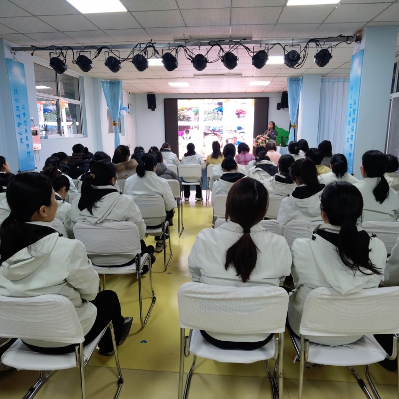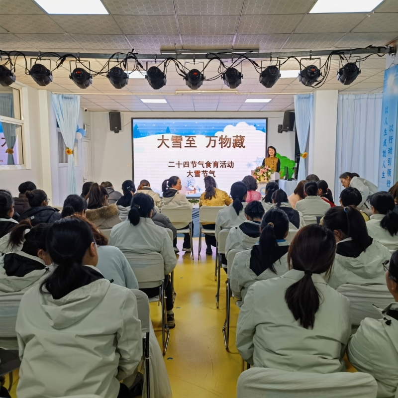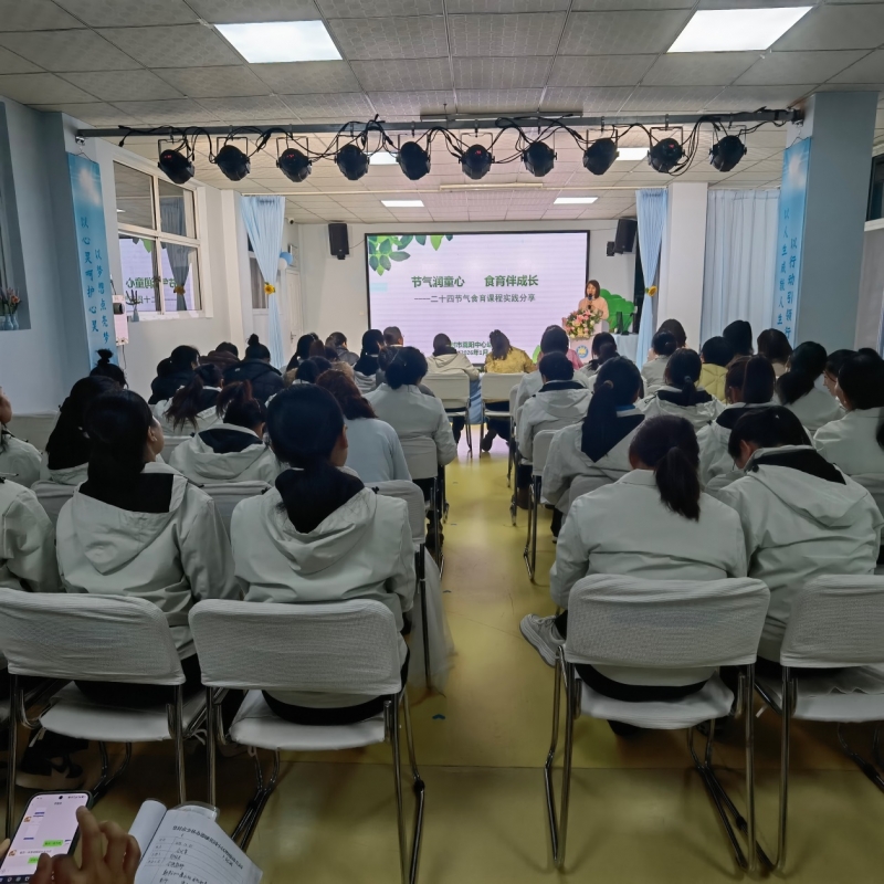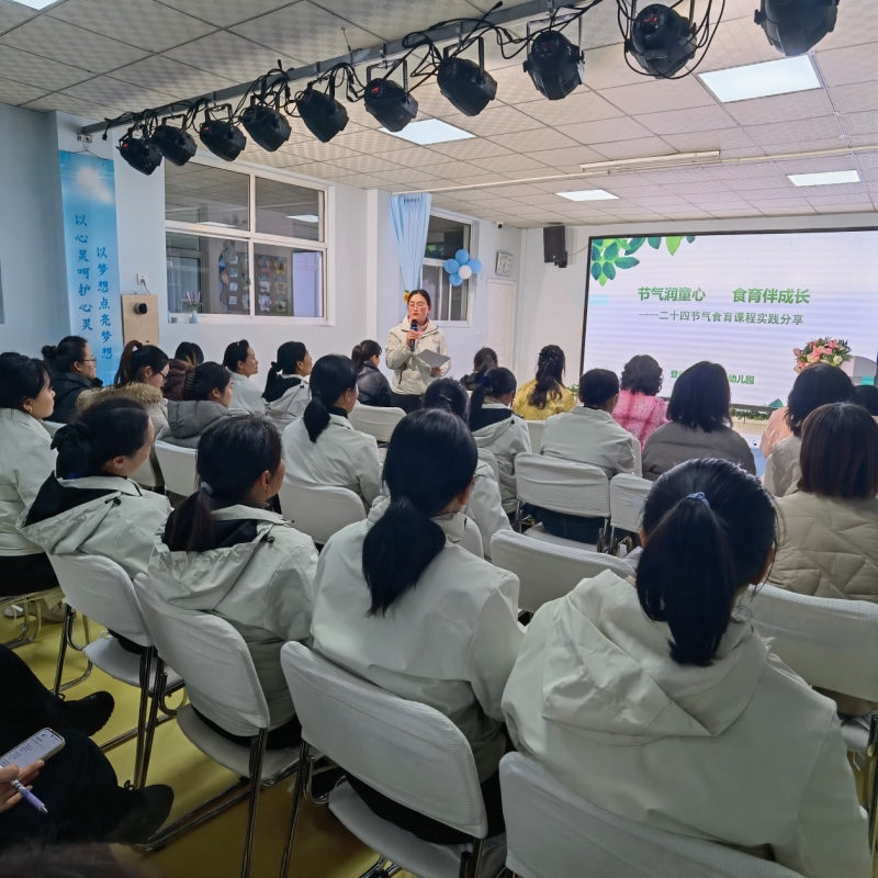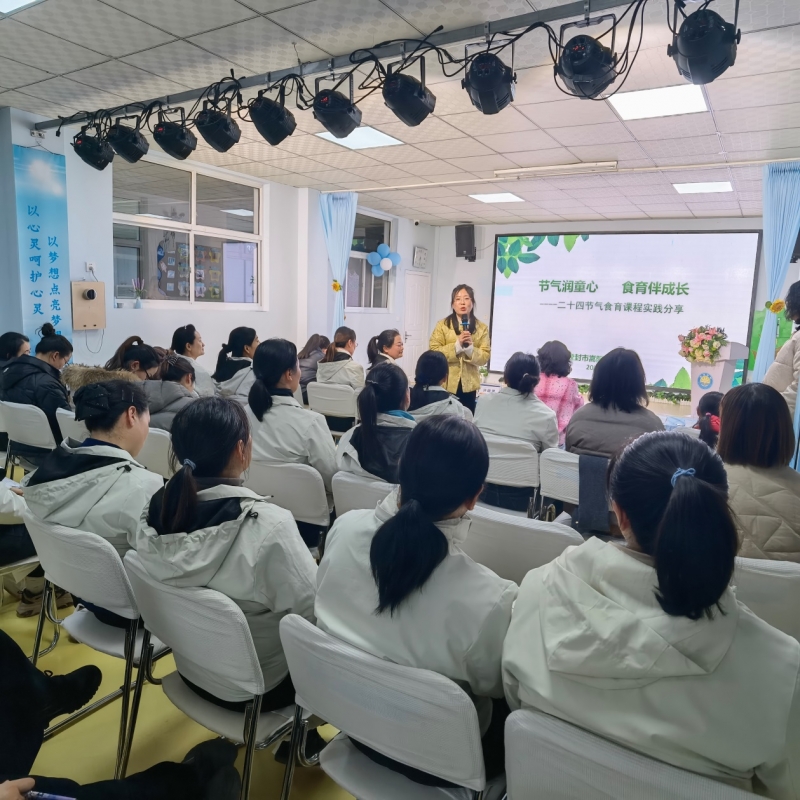随后,工会主席屈娜娜围绕《节气润童心 食育伴成长》这一主题,从课程缘起、目标定位、实施策略三个维度,系统介绍了幼儿园二十四节气食育课程的整体架构与实践思考。她说,节气食育不仅是饮食教育,更是融合文化传承、自然感知与生活教育的综合性课程,其根本在于引导幼儿在与土地、四季、食物的真实互动中,建立与自然、与传统、与生活的深度联结。